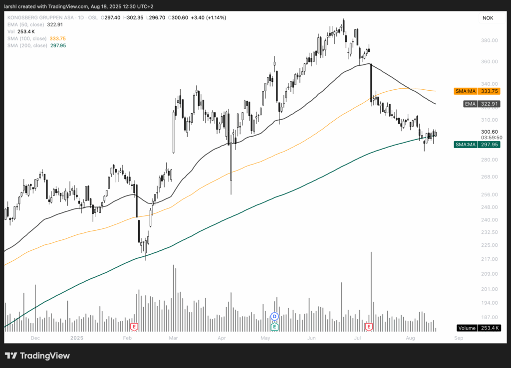 Aksjekursen har falt jevnt siden toppen, og i august har den testet 200 dagers glidende gjennomsnitt (SMA 200), som ligger på 297,95 kroner. Dette er et klassisk langtids støttenivå, og prisen har nå forsøkt å etablere seg over denne linjen. Samtidig ligger både 50 dagers gjennomsnitt (322,90 kroner) og 100 dagers gjennomsnitt (333,75 kroner) godt over dagens kurs. Dette viser at trenden fortsatt bikker nedover på kort sikt, men at vi nærmer oss et punkt hvor bearish momentum flater ut. - Motstand og støtte