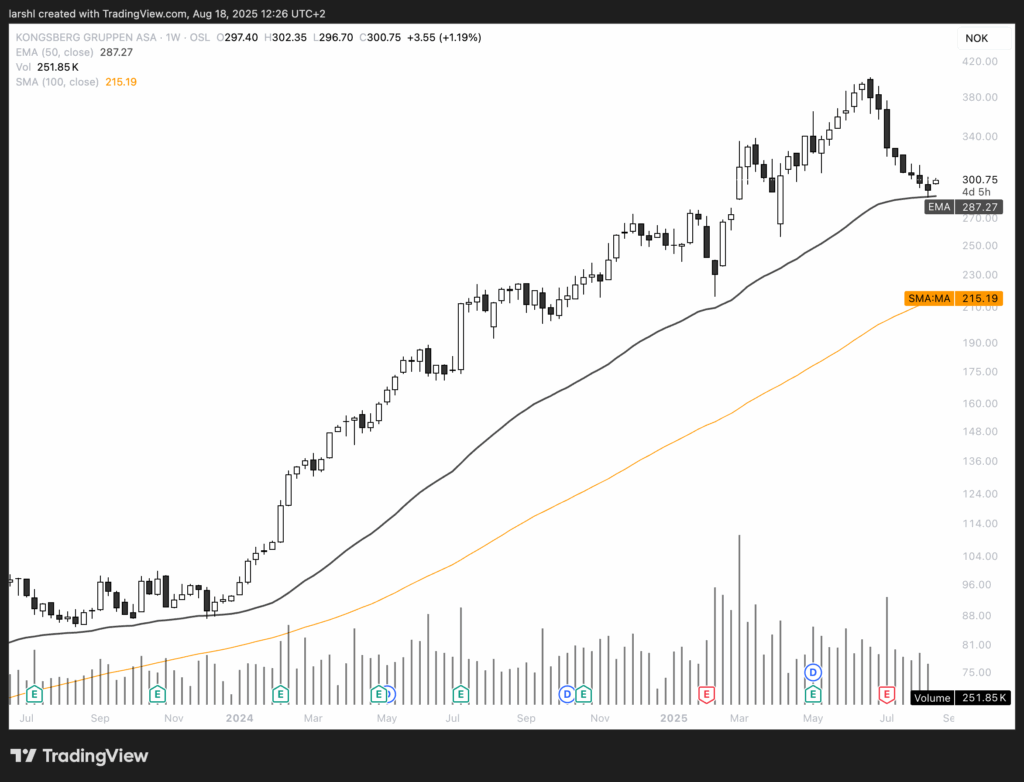 Kongsberg Gruppen (KOG) har vært en av de sterkeste aksjene på Oslo Børs de siste årene, støttet av solide fundamentale resultater og økende interesse for forsvars- og teknologisektoren. De vedlagte grafene – henholdsvis ukentlig og daglig tidsramme – gir et tydelig bilde av situasjonen per 18. august 2025.